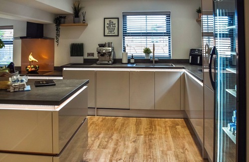 Kitchen area: With 2 electric ovens, 5-ring induction hob, microwave, Ninja air fryer, fridge/freezer, wine cooler, 2 dishwashers and coffee machine.