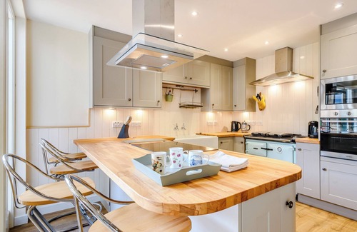 With stylish high-end touches throughout, it boasts five bedrooms, two of which are on the ground floor and have en-suite or next door wet rooms, making this very flexible accommodation. In fact, the property boasts an impressive four bathrooms in total which means this property is perfect for couples as well as families. This is a place in which you can socialise and cook together in the large open plan living space. It is somewhere you can make new memories or raise a glass to old ones. You really are sure to have an amazing stay here and the sunken outdoor patio and the wood burning stove make this a great year-round choice.