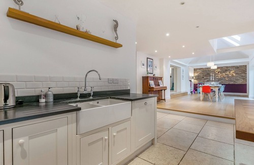 Bathroom: Roll Top Bath, Heated Towel Rail, Toilet. Gas central heating (underfloor in kitchen/dining room), gas, electricity, bed linen, towels, Wi-Fi and fuel for wood burner included. Travel cot, highchair and stairgate. Welcome pack. Back garden with patio, garden furniture, gas BBQ and firepit. Garden barn with pool table, table tennis, air hockey dart board and a selection of board games. Private parking for 6 cars. No smoking.. This absolute stunning six bedroomed house is located just on the outskirts of Whitstable, around 3 miles from the beach. The property is a traditional English country house with plenty of space inside and outside, ideal to enjoy with family or friends. The owners have kitted out the house and furnished it to a very high standard throughout. Children, as well as the adults, will enjoy the large garden including a fun filled games barn with pool table, air hockey, table tennis and much more.