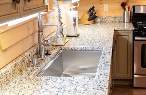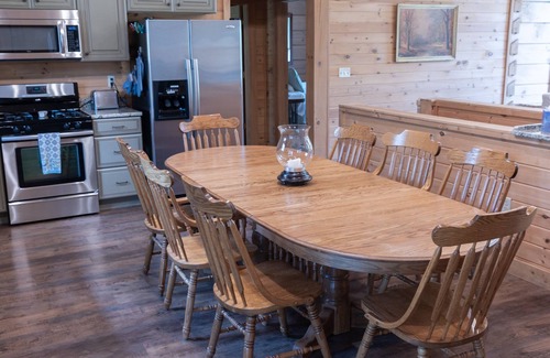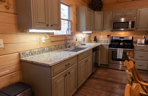 The cabin boasts a fully stocked kitchen, complete with a stove, oven, refrigerator, grill, and all the necessary appliances and utensils to whip up delicious meals. Gather around the dining table and enjoy quality time with your loved ones.