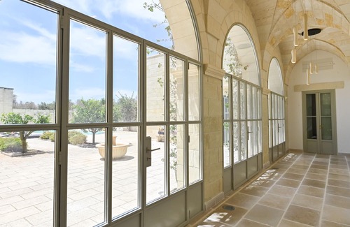The villa is centered around a serene, walled courtyard—truly the heart of the masseria. At night, the grand glass-panelled entrance glows with light, welcoming you into an unforgettable stay.