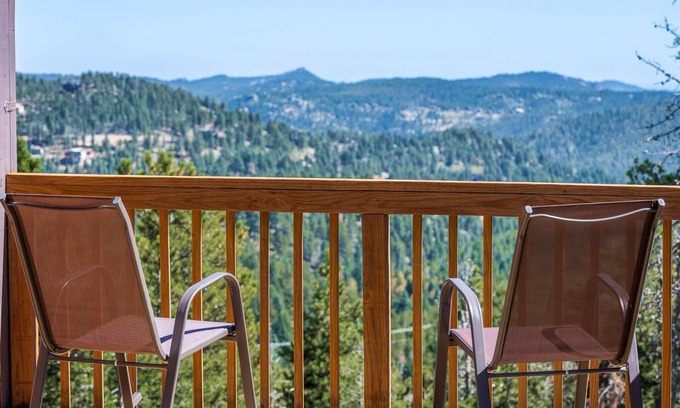 Enjoy scenic mountain views from this 5BR+3BA home, which is a separate upper-level and lower-level apartment in a hillside cabin. This whole cabin features an expansive wrap-around deck with ample outdoor seating. Located just 20 minutes from downtown Evergreen, the property is near hiking trails, biking trails, and fishing spots. Please note that a 4-wheel drive is required to access the property.