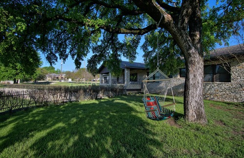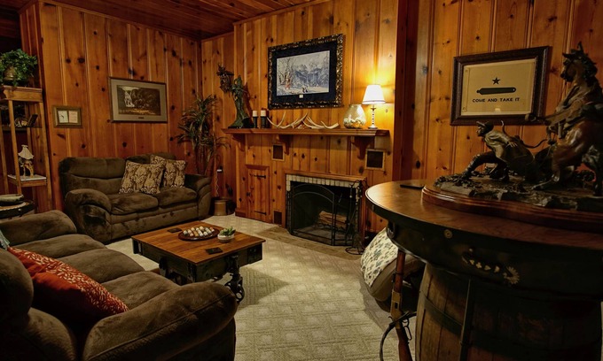 Large stone house on a hill peacefully overlooking the grounds and Barnard St. Knotty pine throughout for a warm old feel and decorated with fine western art. Five spacious and comfortable bedrooms each with a private bathroom. Outdoor covered grill (charcoal) area with tables, hot tub, and an old Chuck Wagon for looks! Everything that you need for the perfect get away, the house is fully equipped with dishes, cookware, coffee & coffee pots, sheets, towels, just bring the food! We also have a game room with giant Jinga and other games for your pleasure. Located just a couple blocks from the charming downtown square and walking distance to shopping and many restaurants. Conveniently located and close to all of the attractions.