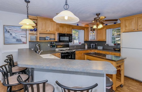 This beautifully designed house boasts two master suites with en-suite bathrooms, a game room filled with entertainment options, and a well-equipped kitchen that makes hosting events a breeze. Enjoy outdoor amenities like kayaks and paddle boards for adventurous afternoons on the water, or cozy up by the new lakeside firepit with Adirondack chairs for romantic evenings under the stars. The screened porch and outdoor bar provide additional spaces for mingling and celebrating, while the fenced doggie park ensures that your pets are part of the festivities.