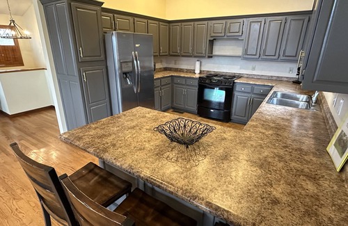 Sit back and relax in the living room while looking through a wall of windows overlooking the lake. For those cold evenings enjoy a fire in the stone gas fireplace. The children can relax in their own space downstairs while the adults are upstairs. Complete with a foosball table, 55" flat screen TV and game table the downstairs is set up to entertain! There is also a ping pong table and dart board for those late night tournaments . The house has has 6 flat screen TVs, Wifi, and Netflix and YouTube TV for your enjoyment, no satellite/cable. There is a cover deck area with large hot tub, party lights and bistro set for additional entertainment. There is a fire pit overlooking the lake, please bring your own firewood.