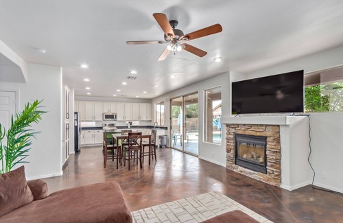 When you enter you are greeted with a ping pong table right away along with a dining table for 10 people and the impressive staircase! The kitchen is fully stocked with great views of the the backyard. Heated pool & spa, lots of bed space, plenty of parking, great outdoor hang out space with firepit and outdoor bar & a ping pong table inside for entertainment & fun!