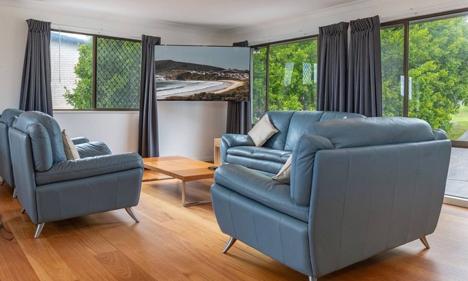 With four bedrooms with two queen beds, a double and tribunk to host up to nine guests, all are made up with linen and towels ready for the bathrooms, just don't forget to bring your beach towels to make use of the local beaches and waterways a few minutes drive away. The loungeroom has split system air conditioning and two of the bedrooms have ceiling fans.