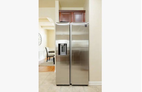 The shared kitchen space can be used to store food and food items in the cupboards, pantry, and fridge/freezer. A washer and dryer are available on the first floor.