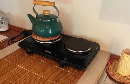 The kitchen is equipped with an oven, a stovetop, and a refrigerator, as well as a coffee maker, an electric kettle, and a microwave. Bathroom amenities include a hair dryer, a bidet, and towels. Other amenities at this 2-bedroom, 1-bathroom rental include bed sheets, an ironing board, and air conditioning.