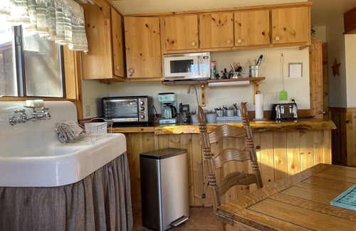 Cozy Cabin/guest house on 5 acres of fenced private land. It has 2 bedrooms and 1 bath. A microwave, toaster oven/air fryer, crockpot, BBQ grill, and coffee pot exist. A rustic cantina, with a firepit, and lots of room to relax. Close to state land, in a quiet neighborhood. 2-hour drive to the Grand Canyon, and 40 minutes from Prescott! We have 3 horses on the property. They are familiar with dogs.