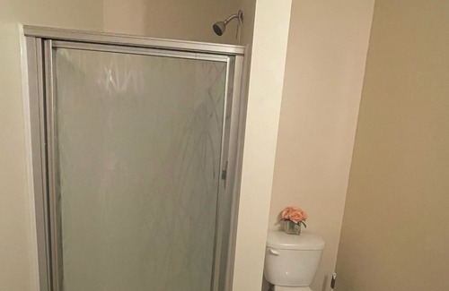 Ample open space on the first level of a beautiful raised ranch house in a quiet cul-de-sac neighborhood. This space has a queen size bed, a large screen TV with a wireless internet. This room has a private full size bathroom.