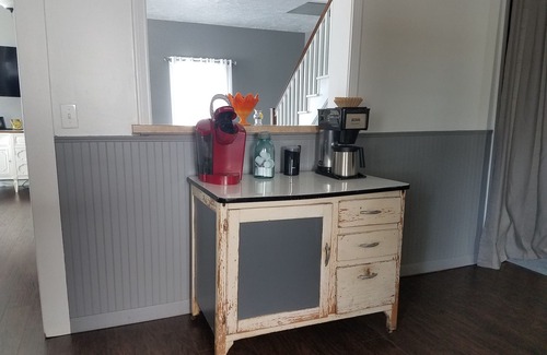 The great room has comfortable seating, a large flat screen smart tv with high speed internet, and a large dining table with seating up to 10 and beautiful lake views from the wall of windows. There are two spacious bedrooms, one with two queen beds (room for an additional cot if needed) and one with two full size beds. There is a bonus room with gas fireplace, twin daybed with twin trundle, flat screen tv, and a full glass garage door that can be opened in summer for a great indoor/outdoor gathering room. A full size bath on the second floor with the bedrooms and a full size bath on main level just off the bonus room. Also laundry with full size washer and dryer. We also provide towels, linens, staple spices, paper products (plastic wrap, foil, paper towels, toilet tissue), laundry soap and dish soap.
