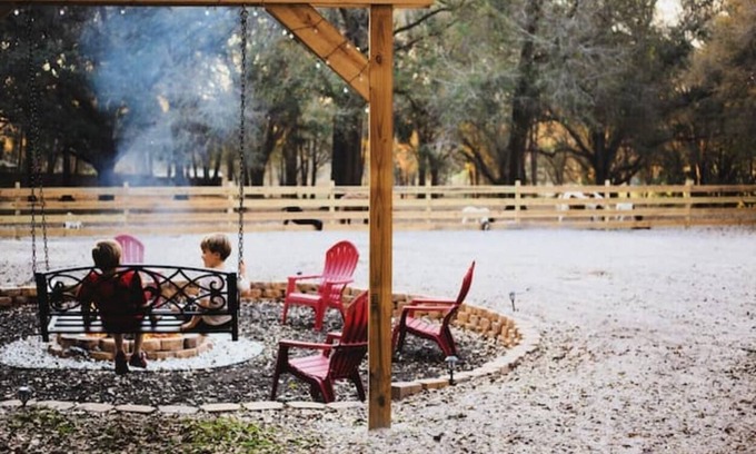 A quiet country retreat: pet the goats and enjoy the large sunken fire pit surrounded by nature. See wild deer, turkey, raccoons, eagles, and more. Majestic live oaks with plenty of space to let the kids or pets run free. Enjoy the cornhole and tree swing. Enjoy the covered picnic area and swing near the fire, or have a BBQ at our resort-style outdoor entertaining area. No city lights here; see the stars in their full glory while relaxing at the fire pit.