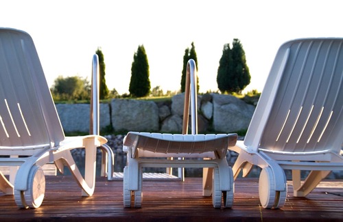 Our organic pool is equipped with a toddler area. Next door is the Finnish sauna in the log cabin with fireplace and a Kneipp pool.