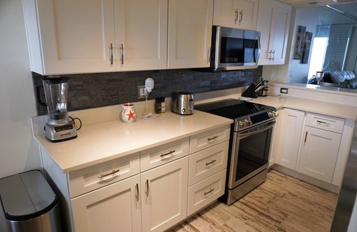 The Gourmet kitchen contains all premium stainless steel appliances, coffee maker, blender, toaster, electric griddle, spices and all utensils, pots and pans. There is a separate dining area with a table and four chairs there is also a breakfast bar with four bar stools.