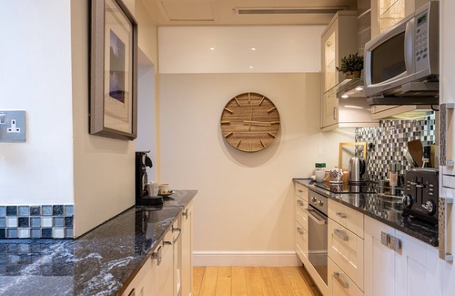 • MANY COMPLIMENTARY EXTRAS & AMENITIES rarely provided by other rentals: Free private car service pick up from Heathrow/Gatwick airports to the apartment for stays of 7 nights or more. CHOICE OF WINE (bottle of sparkling wine, white or red). Fully-stocked "MAXI BAR" with crystal DECANTERS OF SPIRITS (gin, rum, scotch and vodka) and a variety of MIXERS and English ALES & CIDERS. NESPRESSO COFFEE BAR with 12 different brews and dozens of Twinings teas. GOURMET GOODIES, including chocolate and biscuits. SNACK BASKET of chips, nuts, and candies. Kitchen stocked with COOKING OILS, VINEGARS, HERBS & SPICES so all you have to shop for are groceries! Fast WIFI. Smart (Internet-enabled) HDTV with NETFLIX ACCESS. Deluxe bedding/ROBES/SLIPPERS/TOILETRIES. Washer and dryer with laundry supplies.