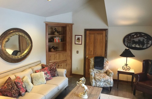 The guesthouse is attached to our main house, but it is totally private, with your own driveway, stairs, and key-less, keypad entrance. The guesthouse is located above the garage, and the two homes share a wall. It is naturally lit by sun through windows in every room looking out over pastures, woods, and aspen- and pine-covered mountains.
