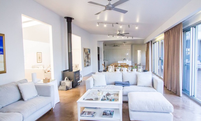 Open plan lounge/dining room with wood heater and northerly aspect. Living dining area includes internet connection. Games room area with gaming consoles, second fridge, pool toys etc. Hypoallergenic polished concrete floors, luxurious bathroom, underfloor heating, free standing soaker tub. Secluded setting with reserve to rear.