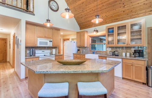 Head-turning wooden interiors, vaulted ceilings, copper pendant fixtures, buttery cabinetry elegant finishing, and kitchen complete with granite counters ang farmhouse sink plus island pair beautifully in this lodge inspired home. Sunlight filters through an orchestra of Pella windows bringing the outdoors in with its large frames. Master suite has a Cal King bed and boast jetted tub and double vanity, while two additional full bathrooms means no sacrificed comfort. Expansive second story has two beds and two insets with queen mattress for bonus sleeping quarters.