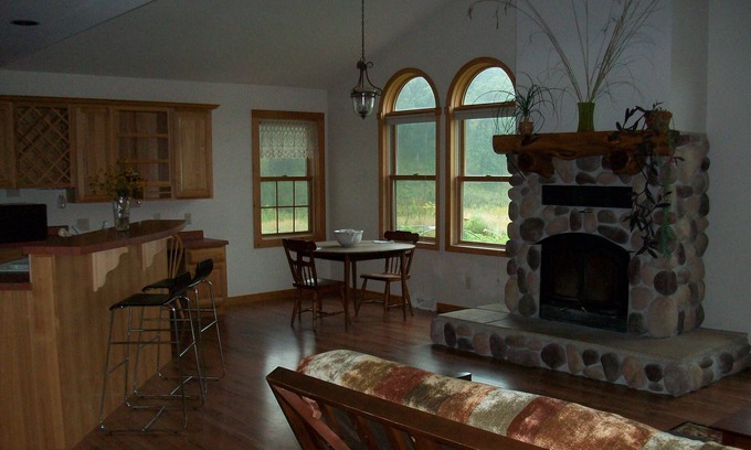 Dottie's Place a 2 bdrm private space. Gorgeous views of the valley from the Master bedroom and the open adjoining living and kitchen space includes a warming fireplace.. The master bathroom has a jet tub, with abundant natural light. The kitchen is equipped with pots and pans and utensils. There is a hideabed for additional guests. we offer coffee and eggs when the resident chickens are laying eggs. We have a few chickens and raise heritage hogs. 2 times a year there are piglets on the ground.
