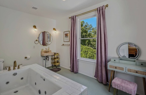 Located on the second floor, our retro room takes you back to the nostalgia of a 1950's drive-in theater! Recreate the fun as you watch your favorite flick on a 120" projector screen. During intermission, watch kernels pop in our old-fashioned pop-corn machine and enjoy on our 50's diner pub table. The luxurious ensuite bathroom features a giant two-person jetted tub (no shower), period-style make-up vanity, original vintage sink, turkish towels, and terry robes. The room includes retro mini-fridge and Keurig.