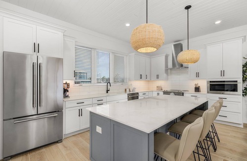 Head upstairs to the top level to find the remaining three guest bedrooms, all thoughtfully designed with queen-size beds and inviting decor. One of these bedrooms includes its own en suite bathroom with a tub/shower combo. The other two share a spacious hallway bathroom featuring a walk-in shower and double vanity. One of the bedrooms also includes private balcony access, perfect for enjoying morning coffee or a sunset breeze. The crown jewel of Chasing Sunshine is the luxurious primary suite, also located on the top level. This serene retreat features a queen-size bed, balcony access with stunning views, and a grand en suite bathroom. The primary bath includes a spacious walk-in shower, a freestanding soaking tub, and an oversized vanity, offering a true spa-like experience.