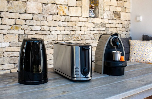 The open-plan kitchen equipped with ceramic hobs includes a refrigerator, freezer, microwave, oven, washing machine, dishwasher, coffee maker, toaster, kettle and citrus press.