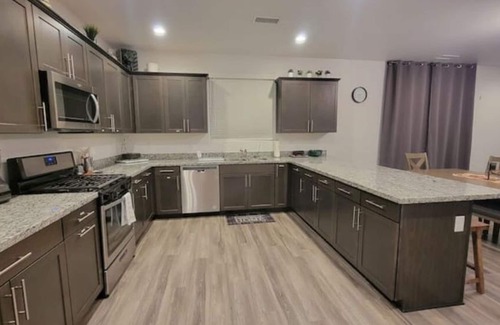 The house has 2 floors, 5 bedrooms and 3 full bathrooms. Downstairs, you can enjoy the spacious open concept kitchen/dining/living room, a bedroom with queen bed, a full bathroom, backyard complete with cookout seating and grill, and full access to a 2 car garage.