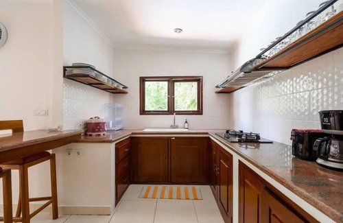Step into the welcoming living room and dining area, seamlessly connected to the garden and pool area, creating a space perfect for casual gatherings and relaxation. The fully equipped kitchen with a breakfast bar offers convenience and functionality, allowing guests to prepare meals with ease while enjoying the laid-back ambiance of the villa.