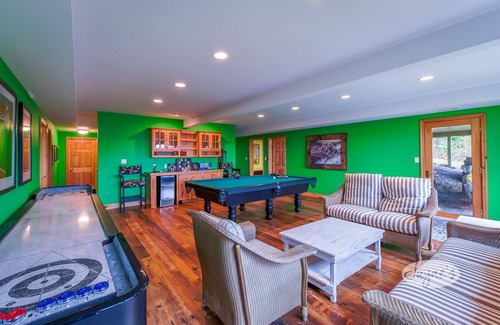 Features a wet bar with mini fridge, a pool table, shuffle board and seating for 6.