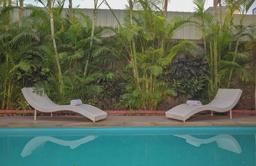 CC Royale - 5 BHK a Home with a private swimming pool, air conditioning, free WiFi, a garden and a terrace. The villa has ample sunlight and fresh air and is constructed very beautifully.A flat-screen TV, a dining area, a fully equipped kitchen, and a balcony with pool views and top floor terrace with 360° views. There is a caretaker service, cook (at an extra cost) & private parking available on site.
