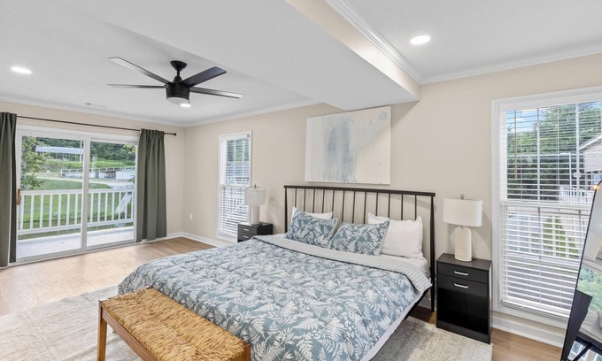 Bedroom 1 (Master - right side, lake-facing): King bed, air conditioning, ceiling fan, ensuite bathroom