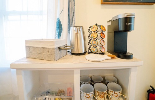 - Modern appliances: refrigerator, microwave, Keurig coffee maker with free pods, toaster, blender, tea kettle, and air fryer.