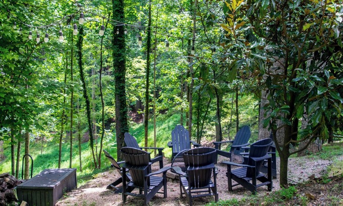 At this 8-acre mountain retreat, enjoy two private homes, a 75-foot waterfall, on-site hiking trails, and plenty of space to unwind. Spend mornings exploring the trails, afternoons at the outdoor bar, and evenings around the fire pit. With five bedrooms split between main house and bungalow, this is a rare find for quiet big group getaways in the Blue Ridge. Each stay includes daily free tickets to popular local attractions like Biltmore, Axe Throwing, Ziplining and more.