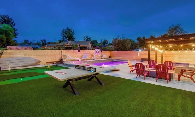 Newly remodeled 5-bedroom home (9 beds, 3 baths) packed with family-friendly fun! Enjoy a pool, jacuzzi, mini golf, cornhole, fire pit, arcade games, and TVs in every room. Spacious and perfect for groups, it's close to top restaurants and just a short drive to downtown, beaches, SeaWorld, the Zoo, and Balboa Park!