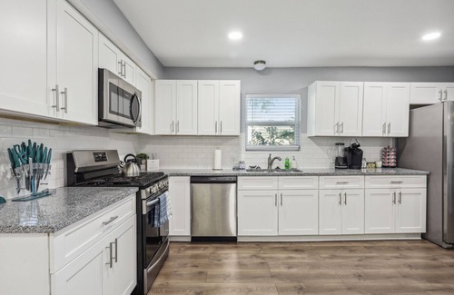 This remarkable home boasts an array of amenities tailored for relaxation and entertainment, including a full gameroom complete with arcade games, foosball, and air hockey to keep your guests entertained. Each bedroom features a 55” Roku TV, allowing for cozy movie nights after the festivities. With four dedicated workspaces and lightning-fast 1,000 Mbps Wi-Fi, you can stay connected, making it perfect for both leisure and any last-minute wedding planning. Enjoy the convenience of a fully-equipped kitchen, spacious sleeping arrangements, and ample parking for up to 10 vehicles, which is ideal for accommodating guests or vendors visiting for your wedding.
