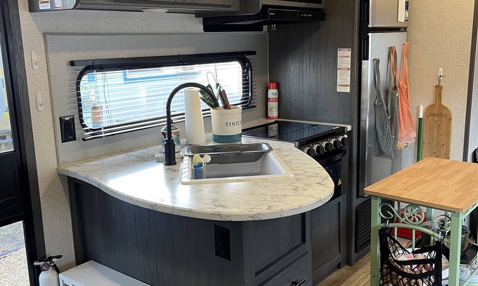 The camper is located on the driveway of a residential lot. The neighborhood is quiet. It is located just 5min. away from NASA’s Kennedy Space Center so when there’s a rocket launch, you can watch it directly from outside. (Sometimes you can even feel the rumble). This is a shared space. The front yard is available for kids to play. The backyard is currently under construction so will be off-limits for the time being.