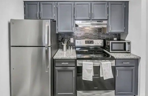 The kitchen features stainless steel appliances with a full-size fridge, range/oven, dishwasher, and microwave. You'll also find a spacious, single-basin stainless sink and modern single handle faucet amongst gleaming granite countertops and modern backsplash. Enjoy the Keurig with a complimentary serving of teas and coffee. The charcoal cabinets are fully stocked with pots, pans, baking sheets, cooking utensils, silverware, dishes, glassware and toaster.