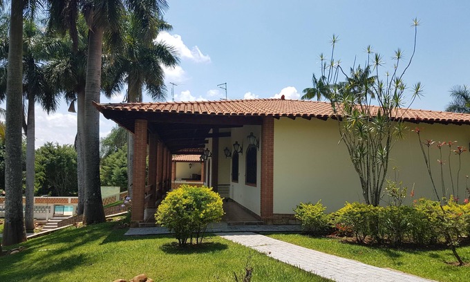 Farm of 6,000 square meters, maintained by a caretaker and his family who live in another house within the farm. Located near the Country Club of Valinhos, between the cities of Valinhos and Vinhedo. 3 bedrooms with TV and ceiling fan, 4 bathrooms, beds for 15 people, covered spaces for 4 cars and outdoor spaces for 4 cars, Leisure complete with: 20 meter swimming pool with SOLAR HEATING and waterfall, Orchard with many fruit trees, Imperial Palms , Flowers and wild animals that frequent the place such as marmosets, skunks, hawks, doves, thrushes, etc. Barbecue, PROFESSIONAL BREWER METALFRIO and Brick oven for Pizza, grassy soccer field, Playground, Pay TV Complete, Internet with WI FI, close to supermarkets, Bakeries and Shopping Valinhos. Access through paved streets, and the street of the property is monitored by cameras and motorized security.