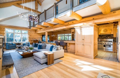 Majestic log and towering ceilings allow for plenty of natural light and views of the ski slopes. Cozy up and watch your favourite movie on the large sectional sofa in front of the stone, gas fireplace. Open to the kitchen and dining areas and the upper loft gives this space a grand feel.