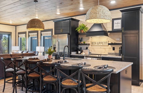 The chef of your group will feel right at home in the large kitchen. This modern room features stainless steel appliances, sleek granite countertops, and all the basics you’ll need for whipping up meals for the whole group. There’s also a convenient coffee station and a large dining area with amazing views of the property's treetops.