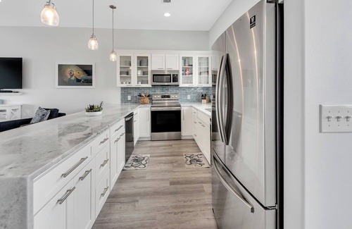 The chef's kitchen features rare quartzite and dolomite waterfall-edge countertops, hand-poured Italian tile, two full-sized refrigerators, double dishwashers, and high-end appliances including an air fryer, cappuccino machine, crockpot, rice cooker, and more. A dedicated bar area with beverage cooler and blender allows for effortless entertaining. Guests can dine together at the oversized indoor table, in the cozy breakfast nook, or at one of two outdoor dining areas.