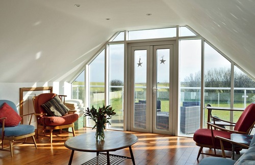 Bathroom: Bath, Cubicle Shower, Heated Towel Rail, Toilet. Oil central heating, electricity, bed linen, towels and Wi-Fi included. Initial fuel for multi-fuel burner included. Travel cot and highchair.. Enclosed 1¾-acre lawned garden with sitting-out area and garden furniture. Balcony with outdoor furniture. Private parking for 3 cars. No smoking.. Standing in a 1¾-acre garden, this superb, house is perfect for large family holidays. Hamilton Lodge with its annex will sleep 12 in comfort, however for a smaller group, particularly as we welcome up to 3 pets, it can also provide flexible and very spacious holiday accommodation to spread out between the two properties. Featuring a sitting room/kitchen which is a delightful vaulted area with French windows opening onto the patio and garden. The main accommodation is extremely spacious with a charming ground floor living room which leads to a bright and airy garden room, as well as a sitting room on the first floor which opens onto a stunning balcony with far reaching sea views. The open plan kitchen/dining room is ideal for enjoying family meals, and the enclosed lawned gardens give children and dogs a place to run and play. From the gate at the far end of the garden, visitors can take a stroll along the public footpath which leads down to the dog-friendly sandy beach.