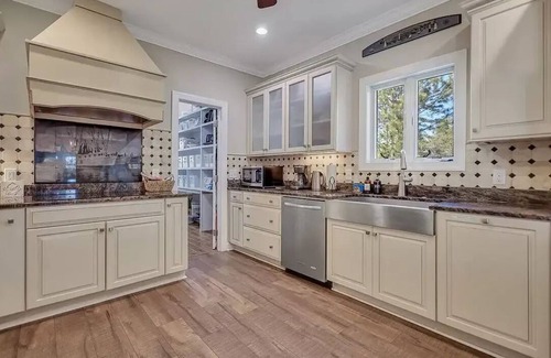 A chef's kitchen with custom cabinetry and marble countertops is fully stocked with dishes and Henkel cutlery to serve your guests. KitchenAid appliances include a double oven and warming tray, 5 burner induction cooktop with stainless steel ceramic cookware, a large refrigerator with in-door water dispenser, a dishwasher, and all the small appliances you need. A butler's pantry leads to a work nook with a desk.