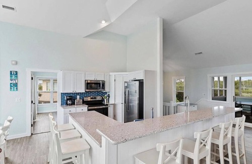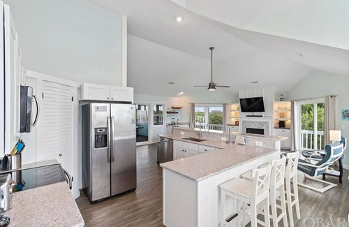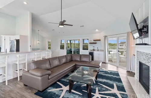 This modern, recently renovated, six (6) bedroom semi-oceanfront home is located directly across from the lifeguard-manned (in season) beach access and boasts stunning ocean views. In the morning you can sip coffee, relax on the front deck, and watch the sunrise. In the afternoon, you can admire the sunset and stars over the Currituck Banks Reserve from the back deck.