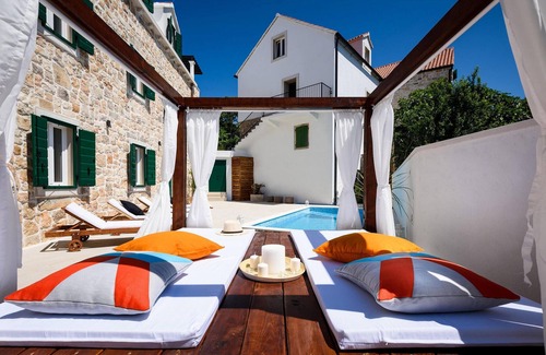 Beautiful Villa Eterna located on the sunny island of Brač in central Dalmatia is a true oasis of tranquillity where you can enjoy surrounded by peace and privacy. The isolated position and rustic ambience of this luxury villa built from the beautiful Brač stone, provides an atmosphere of maximum pleasure and relaxation.