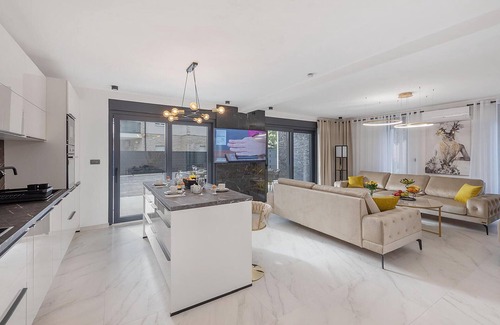 Outside, a spacious terrace with dining area and high-quality lounge furniture awaits you. The inviting pool with water features and cosy loungers ensure relaxing hours under the Croatian sun. The covered barbecue station makes for cosy barbecue evenings with family and friends.
