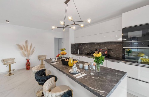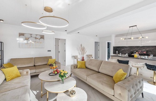 This elegant holiday home welcomes you with a bright, tastefully furnished interior. The modern high-gloss kitchen with cooking island makes feasting together a pleasure. The adjoining living area, furnished with comfortable sofas in soft colours and golden accents, receives plenty of natural light thanks to large panoramic windows. Wide sliding glass doors provide easy access to the outside area.