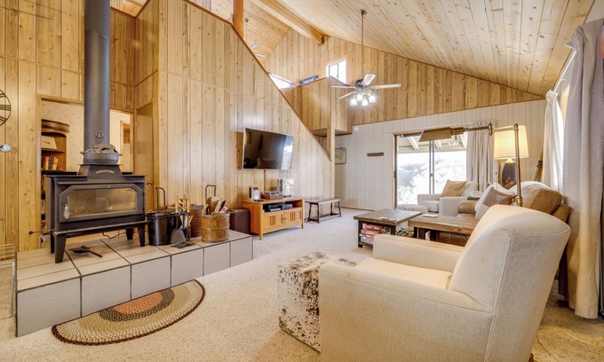 - Riverfront dog-friendly retreat with a rustic flair & wood stove, near skiing