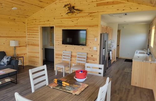 Come stay in your cabin on the shores of Devils Lake. Each cabin has 2 bedrooms, 2 bathrooms, full kitchens, grills, and all your utensils to go with it. There is a dock for your boat, and the public Six Mile boat launch is 1 mile away on the water, 3 miles driving. The property is 7 acres with 4 individual rental cabins. It is on a dead-end road on North 6 Mile Bay. It is quiet and spacious, but there are other guests on the property. There are shared docks between the 4 cabins but there is room for 4 boats. There will be more amenities added as they are built and will be updated in the pictures as they come. Some coming soon will be a fish cleaning station, laundry mat, more dock space.